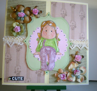TGF called Autumn Anya. I have coloured her with Copics and mounted her with Silicone for a raised effect. I have added some ribbon and flowers.