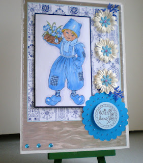 Tellen's Place (Blue and Silver) who are both new to me. I have used another Sugar Nellie Digital Image called the Dutch Boy and coloured with Copics the base card is silver holographic from Dufex the blue paper is from Joanna Sheen I added some flowers, gems and a sentiment.