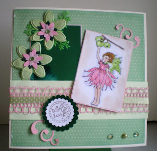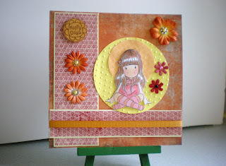 Totally Gorjuss using their sketch the papers are Basic Grey I coloured the stamped image with Copics added some flowers and a stamped sentiment the circle mount I embossed with the Cuttle Bug folder Swiss Dots.