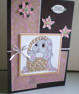 Stamp Something based on their sketch using the colour combo of Pink, Brown and cream. The image is Penny Black and a clear stamp I have coloured this cutie with Copics I have used cream parchment paper for the base brown card, pink gingham papers, brown lame ribbon some gems and flowers.