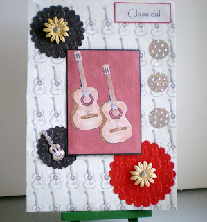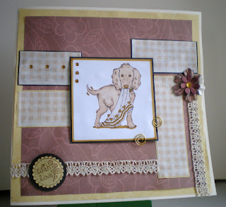 I have used a Mo Manning image coloured with Copics the papers are a mixture I added some cream lace a flower. gems and stamped sentiment. This card will be used for one of my brothers birthdays at the end of January.