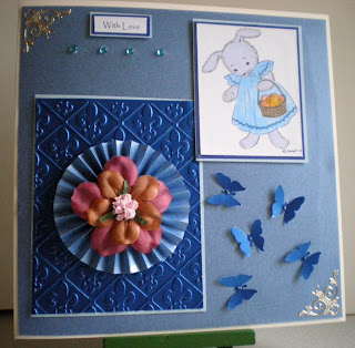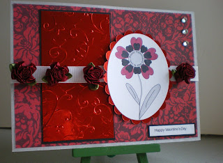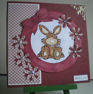 The base paper is from Joanna Sheen's gingham pad, Oliver has been placed in a frame using MCS graphics programme, I then printed him again cut him out and placed him on top of the first image with silicone. I coloured him with pro markers and added some embossed punched out daisy flowers with a gem in the middle of each one. I also mounted the embossed card onto black card then added a Fred She Said flower punched out some leaves from black card and added them, then I found some black stickers in my stash and put four little black flowers in each corner ....I hope you like it and believe me the colour is purple which always looks different when a picture is taken.