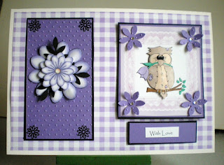 Hi all, this is my card for this weeks Sew Many Challenges #2 the theme is to use Purple, White and a splash of black and I have used Oliver the Owl. I was thrilled to bits when I found that I was one of the 5 runner ups and won three Digital images, this is one of them.