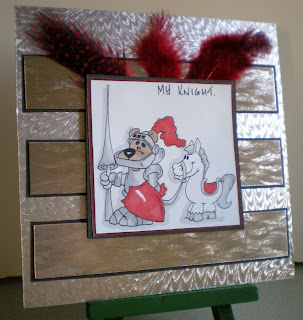 I have tried to include a bit of both in my card a mixture of humour but also masculine, I hope I have succeeded.  I have used silver holographic card for the base then cut three stripes and mounted onto black card.  The image is a Dustin Pike freebie I picked up a long while ago but had never used.  I added some red feathers to sort of match the red feather on his helmet.  I think this card will be used by my mum to send to my son James for Valentine just for fun.