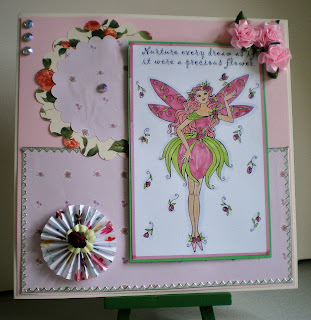 Hi all this is a card I have made for the first challenge at Michelle Perkett Studio the topic being 'Be Inspired'. I have used one of Michelle's fairy Digital Images and the verse at the top of the image says 'Nuture every dream as if it were a precious flower'.  I have used Copics to colour her in a mixture of papers and card, gems, silk flowers and I managed to fold a smaller concertina flower.  I hope you like it and thank you so much for looking. Hugs to all and see you later.