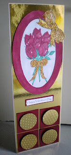 I have used gold mirror card on the base card then punched 4 circles out and used the Cuttle Bug Swiss dots embossing folder then mounted them onto deep red squares.  I finally added a computer generated sentiment. One of my brothers asked if I would make a 'nice' card for his girlfriend for Valentine's Day.