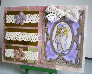 I have used a CDM image from sheet #100 and coloured her with pro markers.  Using my MCS graphics programme I found a vintage frame and transported the first image into it I then printed a second image cut her out and mounted her onto of the first one for a 3d effect.  I distressed the base card/paper with gold metallic rub on and added some gold mirror card and lace....I do hope you like it and for even more inspiration please take time to visit the other DT members their cards are truly fabulous.  Hugs to all.