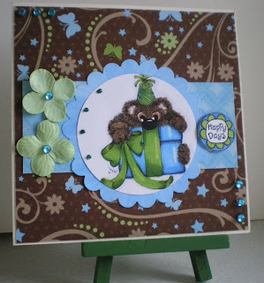 Hi all thought you might like to see the card I managed to make for three challenges the first is Paper Take Weekly which is the sketch, Die Cut Dreams who want to see you use bears and Just Cute Bears whose first challenge is 'One For The Girls'.  I have used one of the Squigglefly Shy Bear images coloured with Copics the backing paper is DCWV which I have had for quite awhile added a couple of flowers and some blue gems.