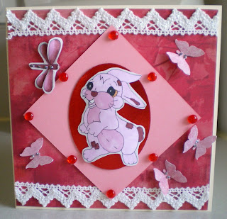 I have used Halen the Hare image which includes the dragonfly I have coloured with pro markers cut both out and mounted Halen on the red mirror card, I have used my punch for the butterflies added some lace, gems and Cosmic Shimmer Silver Twinkles the backing paper is Basic Grey, Halen has a little heart for the nose.