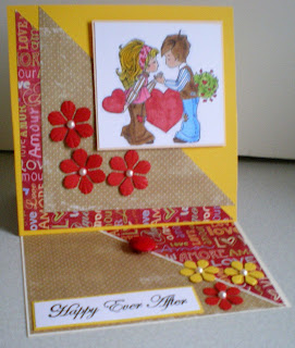 I did manage to make this card on Friday and is for a few challenges whose theme are either Love or Valentine.  I have used a stamped image sent to me by the lovely Nicola in Spain coloured with Copics the papers are Basic Grey the flowers are from my new Nellie Snellen flower punch I have put pearls in the centre.  Hugs to all and hope to see more of you tomorrow.