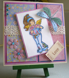 The image I coloured with Copics the papers are Basic Grey the Dragonfly is from Digital Ink & Co which I coloured using my graphics programme.  I punched out a couple of flowers added a few gems the ticket sentiment is from Crafty Ann's.  The challenges I am entering this into are: Flutter By Wednesday, Stamp With Fun and Simon Says.  I hope you like it hugs to all and see you later.