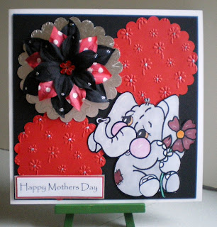 Hi all this is my card for this weeks Sew Many Challenges the theme being Red, Black and Silver.  I have used an eight x eight white card added three circles cut from the Nesties two of which were passed through the daisy Cuttle Bug folder the silver is holographic.  I resized Eris the Elephant and cut her out she has been coloured with pro markers.  The sentiment is computer generated, for added effect I added Cosmic Shimmer Silver Twinkles in the centre of the daisy's and added a large flower.  I hope you like it. Hugs to all see you later.