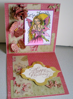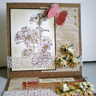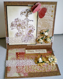 Ok with this one I have used one of my Sweet Pea stamps coloured with Copics the backing papers I believe are K@Co I also used this to punch out the butterflies using both my MS triple butterfly punch and my new SU butterfly punch. Now I have also used the same paper to create my Roses at the top of the card one big one and two smaller ones. I used the tutorial from Brenda and have been practising quietly but this one I am so pleased with I used bronze stickles and pearl stamens to enhance the effect.