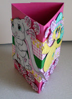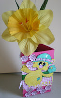 Morning folks this is my entry for this weeks Sew Many Challenges the requirement being to make something with an Easter Theme. I decided to make a Triangle box by following a tutorial at SCS. I have used both Jovi and Duncan for this project so you get the best of both worlds an Easter Bunny and Easter Chick. I chose the colours pink, yellow and green which represents the typical colours of Tulips and Daffodils. I used some pink gingham paper punched both top and bottom I used the same paper to stamp some flowers using my Elusive Image stamp cut them out and mounted them with silicone. The pink base and yellow card is from my stash so is the ribbon. I coloured both Jovi and Duncan with pro markers cut them out and adhered with silicone. Unfortunately I do not have any little Easter eggs yet so I used a Daffodil that I have had for many years to show the box effectively but I can assure you that both of my boxes will be filled with some lovely mini eggs lol. I hope you like my box hugs to all and see you later.