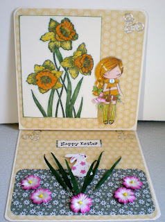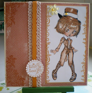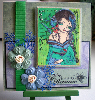 I have used a Sugar Nellie Digi image for this card the papers and ribbon are from my stash I used a mixture of pro markers and Sakura Metallic pens to colour the image the sentiment is an Anita Stamp. The lilac card on the base I have embossed into squares with my Hougie Board. Hope you like it see you all later have a nice day.