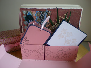 The picture below shows the inside which will hold 6x6 square cards, tages and 3x3 little cards the 3x3 cards I have stamped using a SU stamp the tags I stamped the corners with a branch stamp.