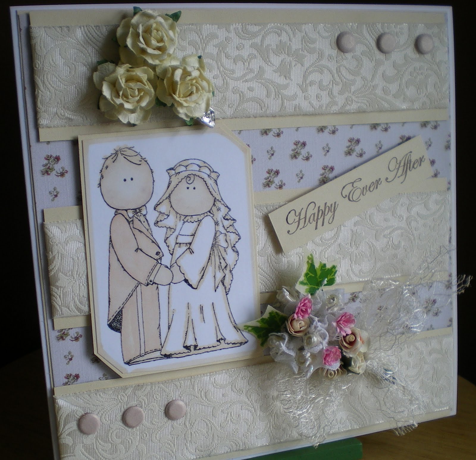 I have used an 8x8 white base card onto that I have mounted cream card with V&A Linen Paper, I then cut three strips of the same cream card and attached some brocade ribbon which I have had for a few years now. The image is H&S coloured very lightly with Vanilla promarker as I just wanted a tinge on the bride's dress the same with the groom.