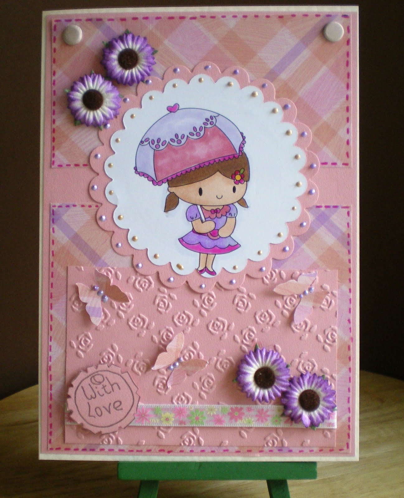 The bottom bouquet is my first real go at a flower arrangement so I think I have to practice lots more I tied a lacy bow around the stems. The flowers at the top are from Wild Orchid I have also attached a little heart charm, the look alike brads are card candy.