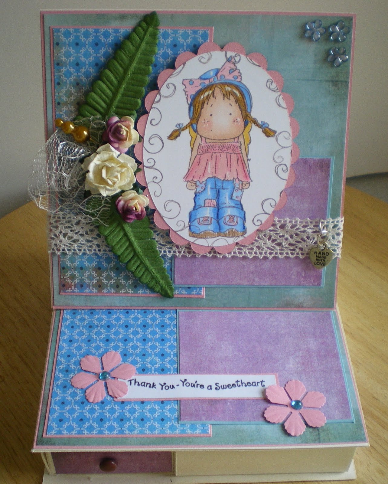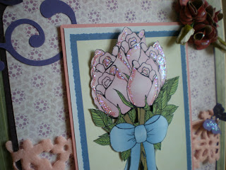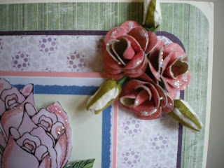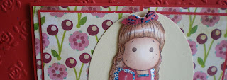 I used cocoa brown Momento ink and coloured with promarkers, I cut her out and adhered her to a pink card cut out with a scalloped Nestie, the papers are a mix of Bearlymine and SU I have added lace on the left side and of course pearls, the papers have swirls on and at the top I added some more pearls to highlight a swirl. I couldn't resist using some flowers which are from Wild Orchids.