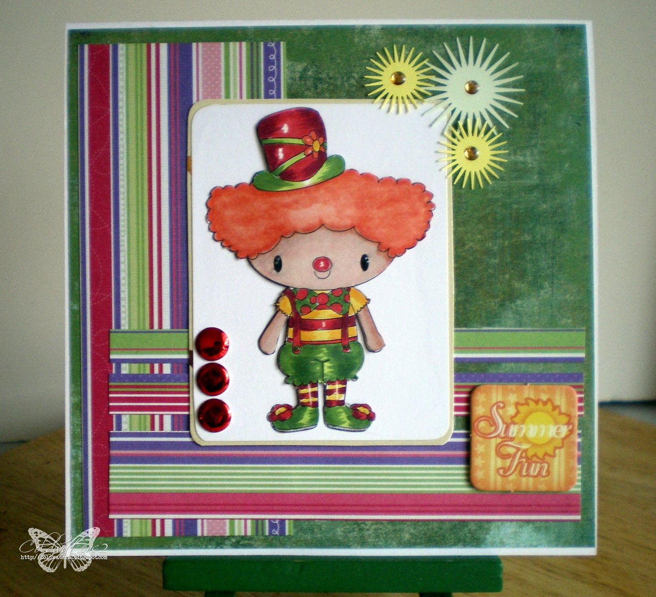 I have coloured the image with promarkers the sentiment is SU, I used Basic Grey papers, added some gingham ribbon and bows also a couple of punched butterflies.
