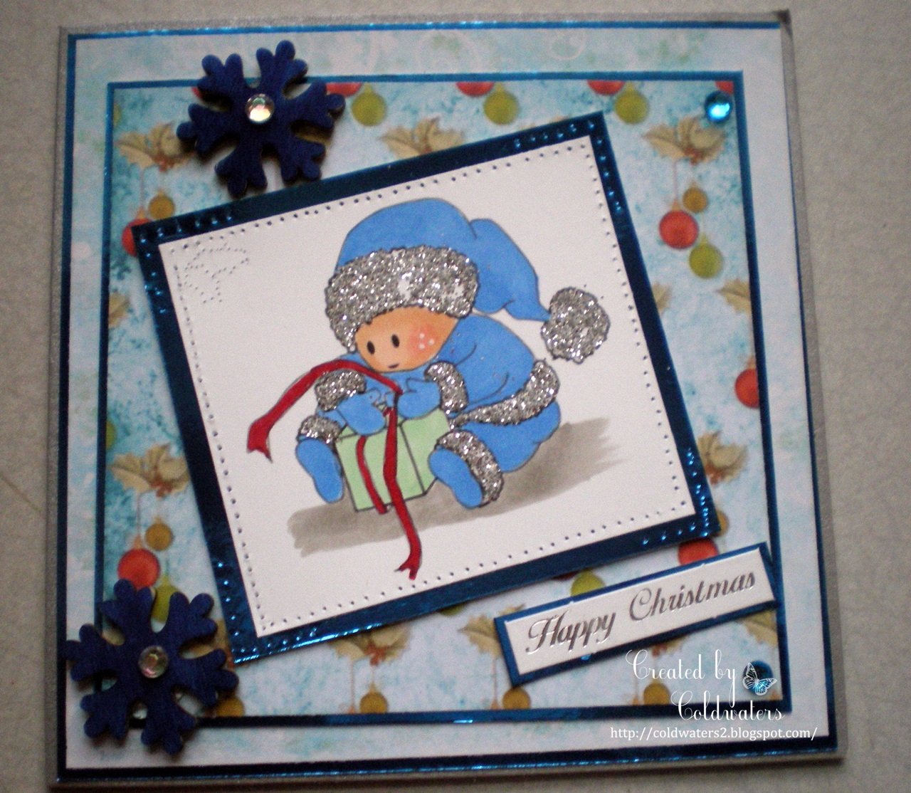 I have coloured the image with Copics and used silver glitter on the furry bits, the papers are from Bearlymine, I have added a sentiment, snowflakes and gems, all have been mounted onto blue mirri card.
