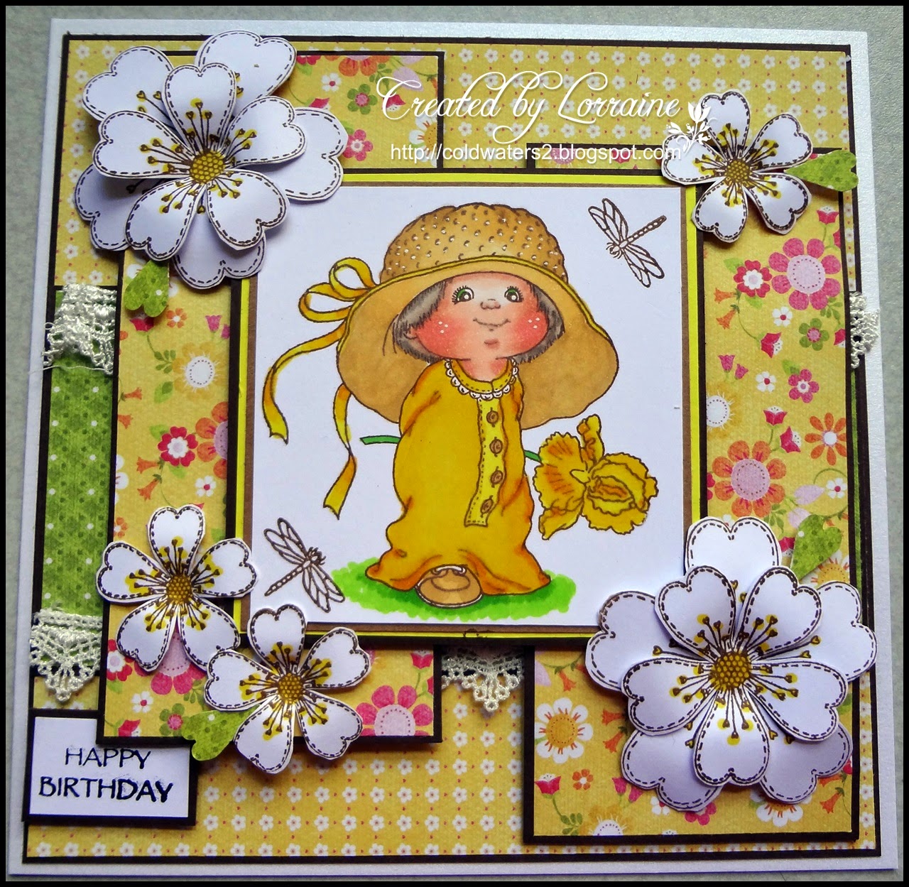 I have coloured the image with Graph It Markers/Copics I also added lots of glitter to her dress, the papers are a mixture of Basic Gray and Bo Bunny, I also added a sentiment, black dazzlers and doily.