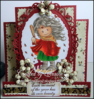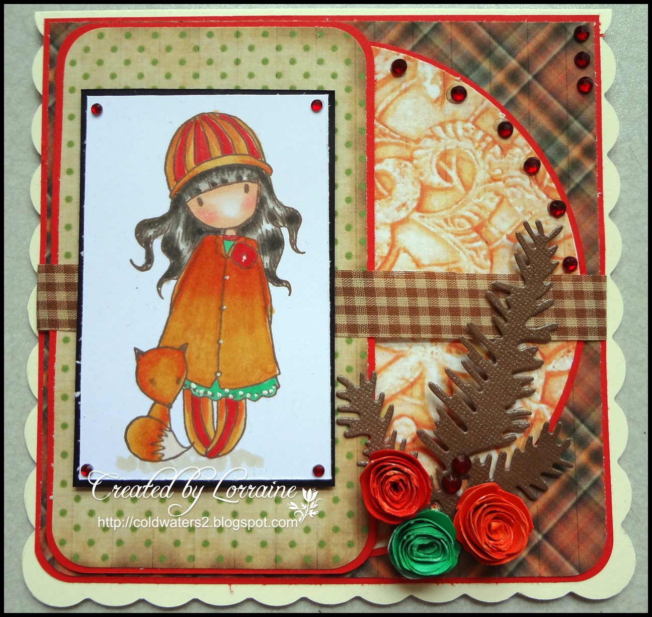 I also made a second card in Autumnal colours just as an added extra bit of inspiration, I used one of my Gorjuss girl stamps, the papers are Bearly Mine, I also added some deep red gems, gingham ribbon, die cut branch and handmade flowers.