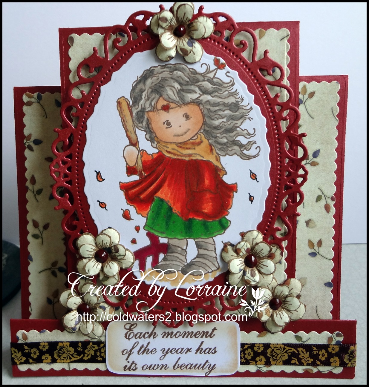 For my card I have used one of my Bildmalarna stamps that I thought was quite fitting for the theme, the stamp has falling leaves but I doodled a few more for effect, I have coloured her with Graph it markers, I have used my Prescut stepper die for the card shape, I have used a burgundy colour card for both the base card and the die cut frame, the papers are LOTV, I also added a stamped sentiment, ribbon and stamped flowers.