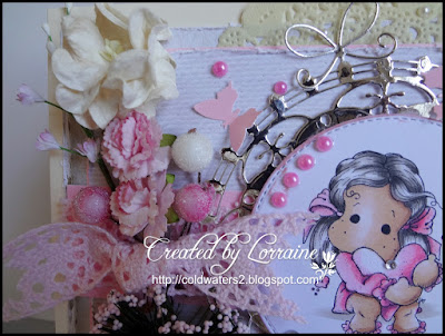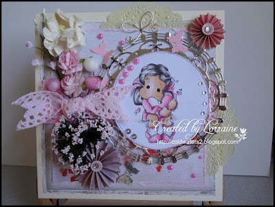 I stamped Tilda with Momento Tuxedo ink then coloured her with Copics I cut her out with a circle stitched die and added pearls and AB gems, I then used another circle die cut in silver mirror card, the papers are LOTV I distressed the edges with my scissors as I couldn't find my little distressing tool but the effect is the same. I added some lace, and lace bow, doilies, flowers and berries, more pearls a rosette and some punched butterflies.