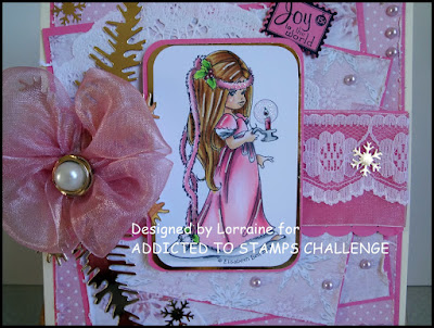 For my card I have used one of my new Elisabeth Bell clear stamps called, Candy's Christmas Candle, I have coloured her with Copics then mounted her onto both gold and pink card, the papers are Bearly Mine, I added lace, pearls, stamped sentiment, die cut gold mirror card branches and punched gold mirror card snowflakes, the bow is wide organza ribbon to which I added a large cabochon pearl, I also added glitter to the candle.