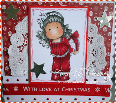 now onto my DT card that features Sneaky Tilda, I stamped her with Momento Tuxedo Ink then coloured her with Copics, I doodled the red frame then mounted her onto red card stock, the papers are from my stash, I added a doily, red printed ribbon, red pearl drops and some shiny stars.