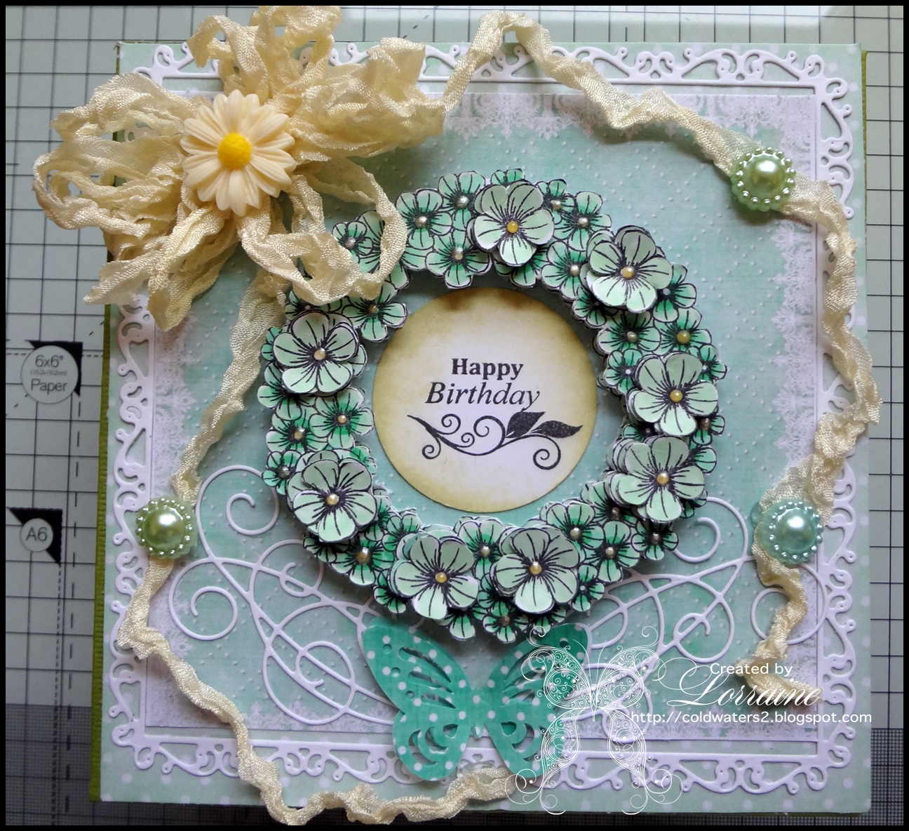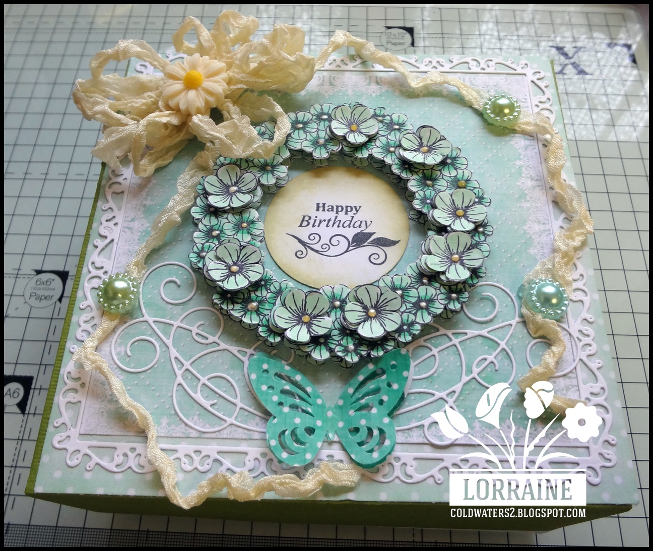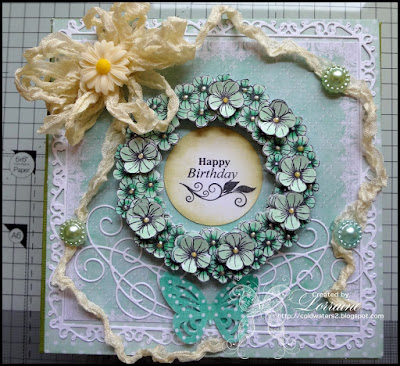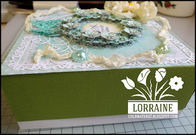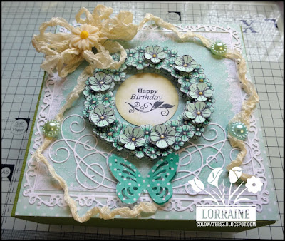 Here is my DT project that I made awhile ago, it is a 7" x 7" box. I have used quite a few new items including the Flower Wreath stamp that I got from Honey Doo Crafts, the sentiment is also from Honey Doo, I stamped the wreath image three times and cut them out , I layered two then cut the larger flower heads and layered them as well, I used my yellow Viva Decor for the centre of the flowers, I also used my new Tattered Lace frame die and swirls die, I added some green flower pearls, resin daisy, butterfly and some of my precious vintage ribbon. The papers are Bearly Mine the box I made using my new Crafters Companion A3 box score board it is amazing.