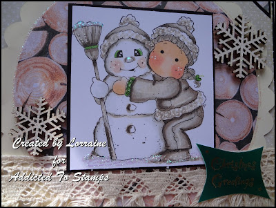 I have coloured with markers, the base papers is from Bearly Mine the log effect paper is from a new pad that I just bought from Cuddly Buddly I used my circle cutter to cut out then matted onto a scalloped circle, I added lace AB Peals, wooden snowflake, sentiment and stickles.