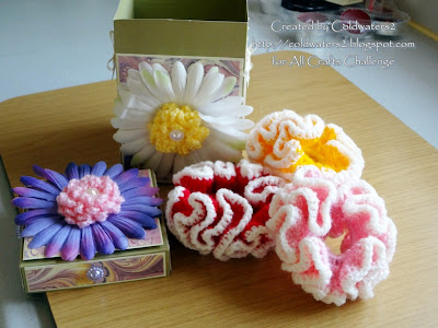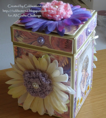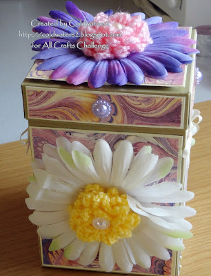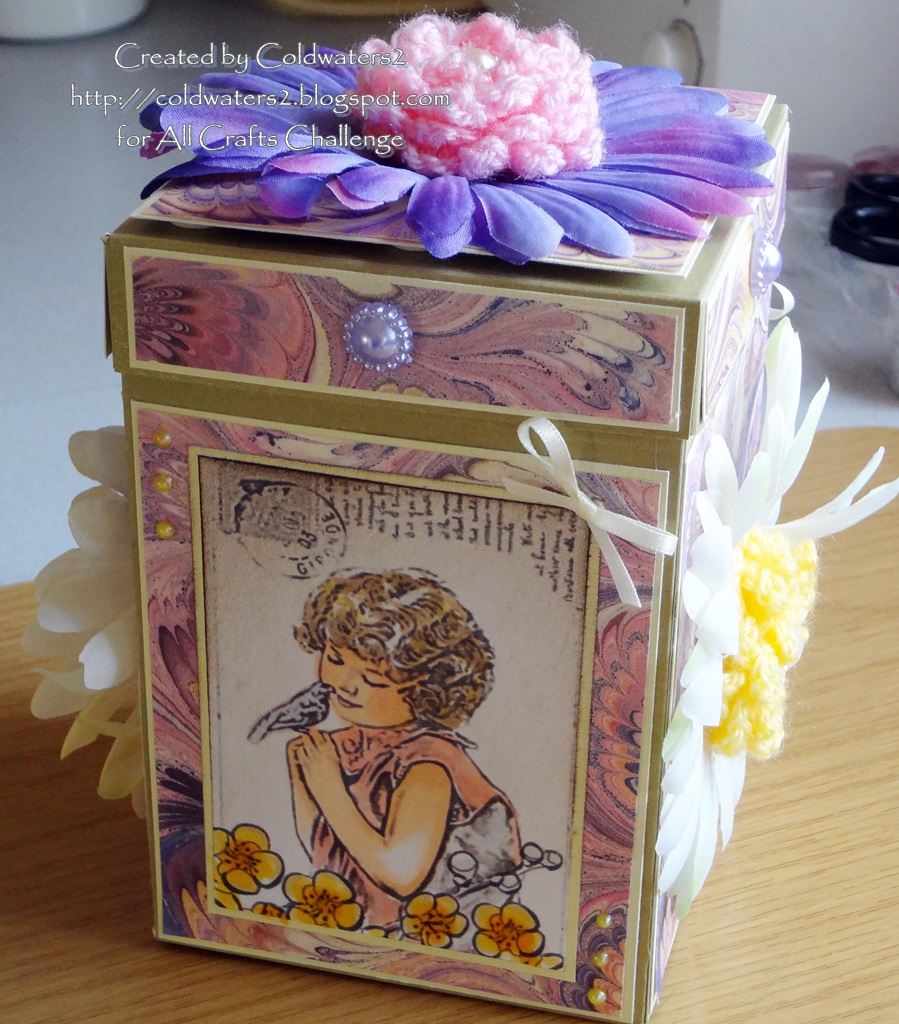 The flowers that I used for the centres I crocheted from a tutorial by HECTANOOGA they are called 'loopy' flowers, I have used flower pearls for their centres plus for decoration around the box and lid.