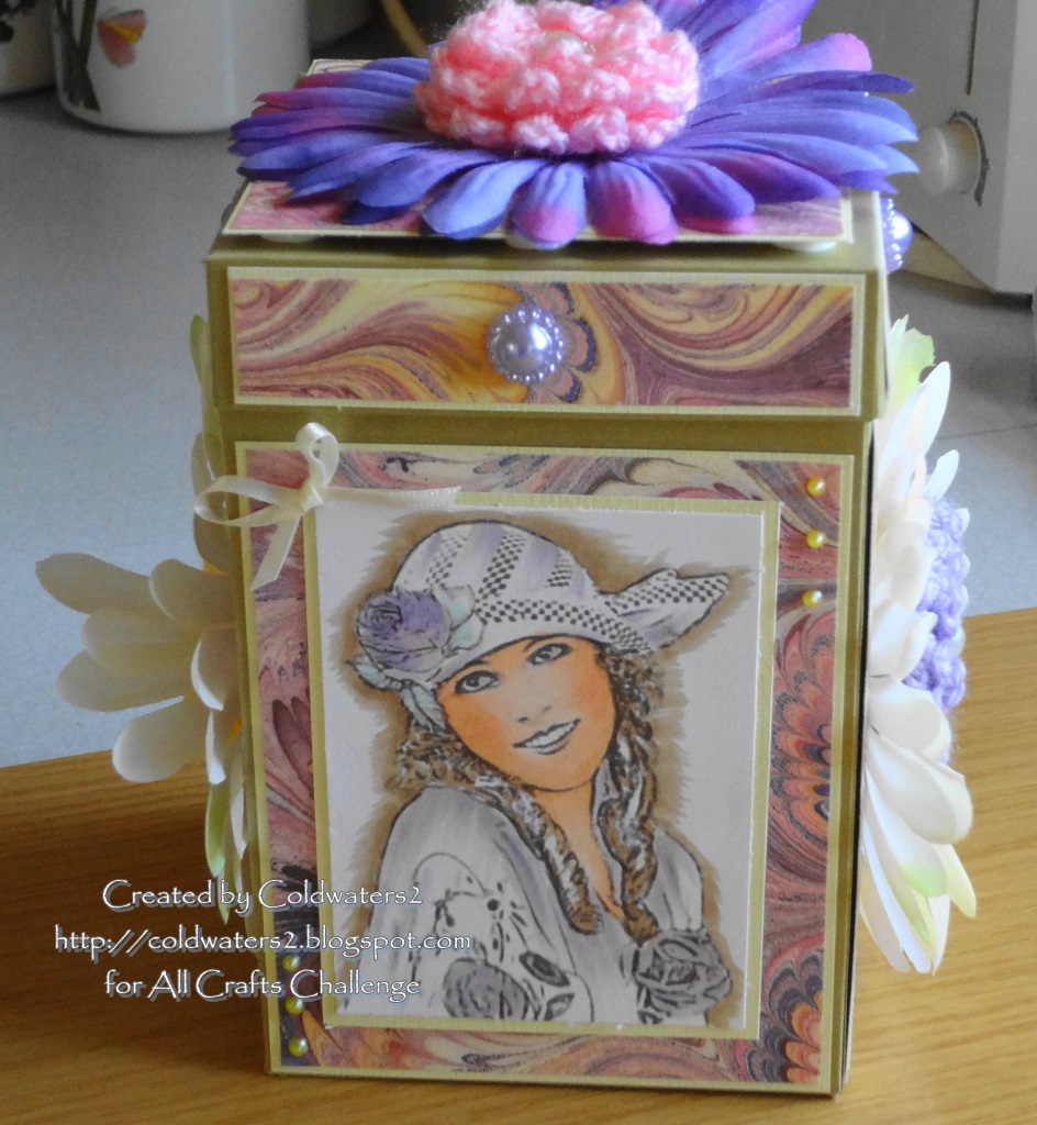 I made the 6x4 box with Kraft card the papers are from a Joanna Sheen pad that I have had for some years, I did all the measurements, cut the paper and mounted it onto yellow linen card.