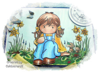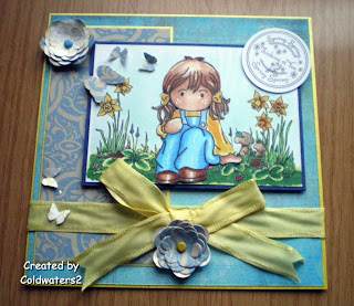 The first is a card and I have used a colour combination of Blue and Yellow, the papers are a mixture, the image of Amy I coloured with Copics then cut her out and sat her among the Spring background of flowers. The flowers at top and bottom are die cuts with small brads as their centres, I also added some butterflies, ribbon and one of the new Crafty Sentiments, sentiment.
