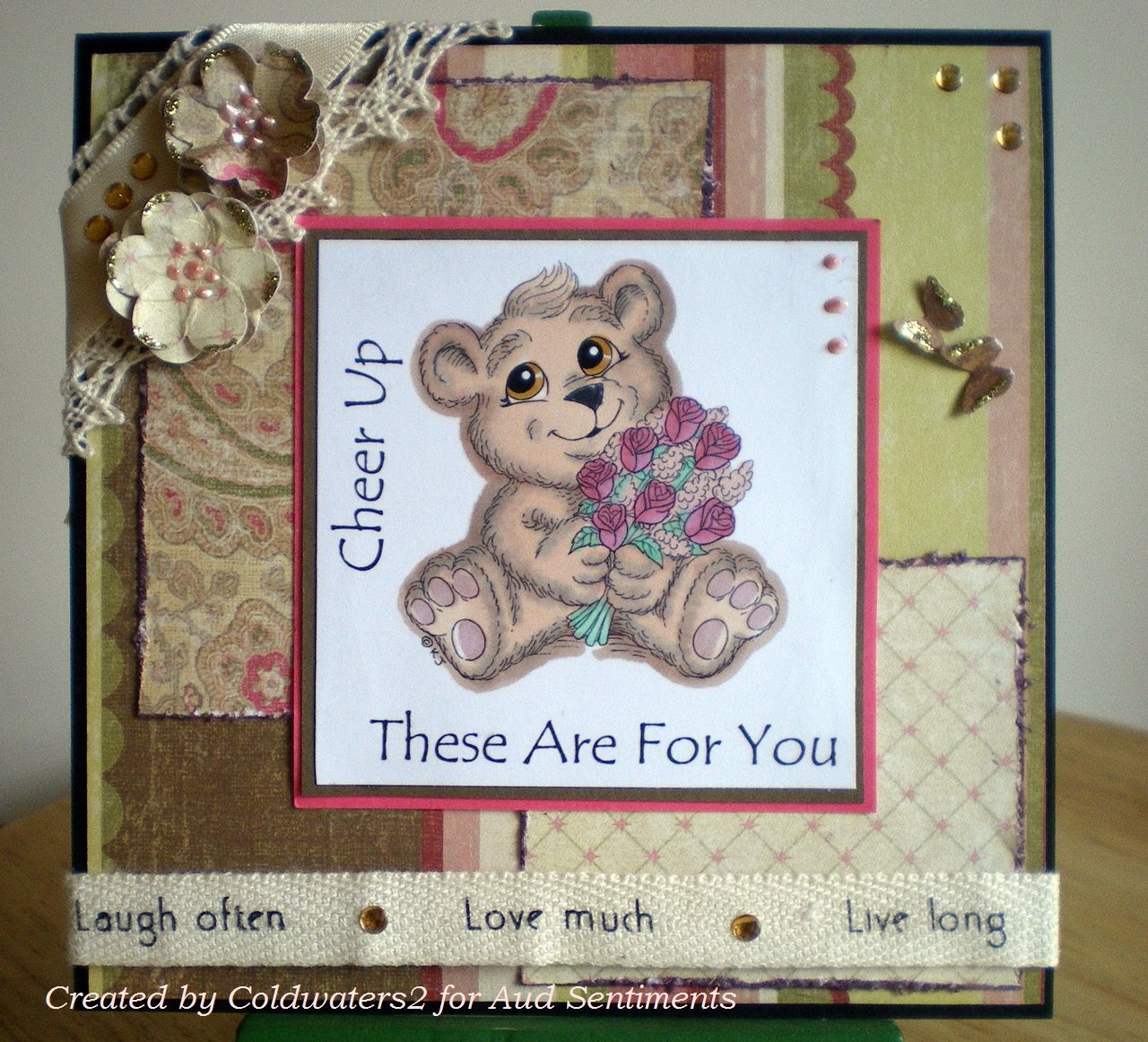 I have coloured the image with Copics both papers are Bearlymine I have added wide ribbon, buttons, flowers and sentiment plus a couple of gems.