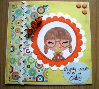 I have used a Karber image for my card and coloured her with Copics, I have used scalloped circle Nestie's, the papers are Basic Grey I added some flowers and card candy the sentiment is from a set of clear stamps available from our monthly sponsor at Stamping Vacation called The Stamps of Life, the link is in my sidebar.