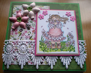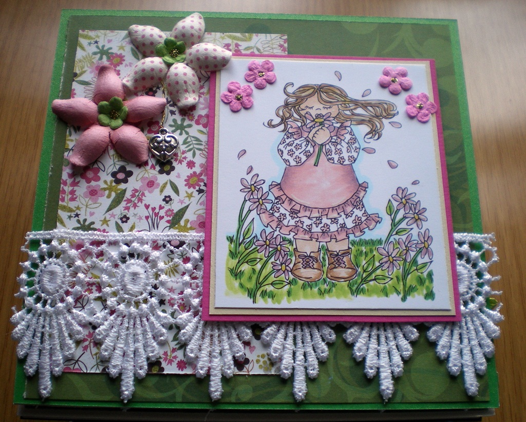 I have used a green pearlescent card base and Basic Grey papers. I have added lace, flowers and charm.