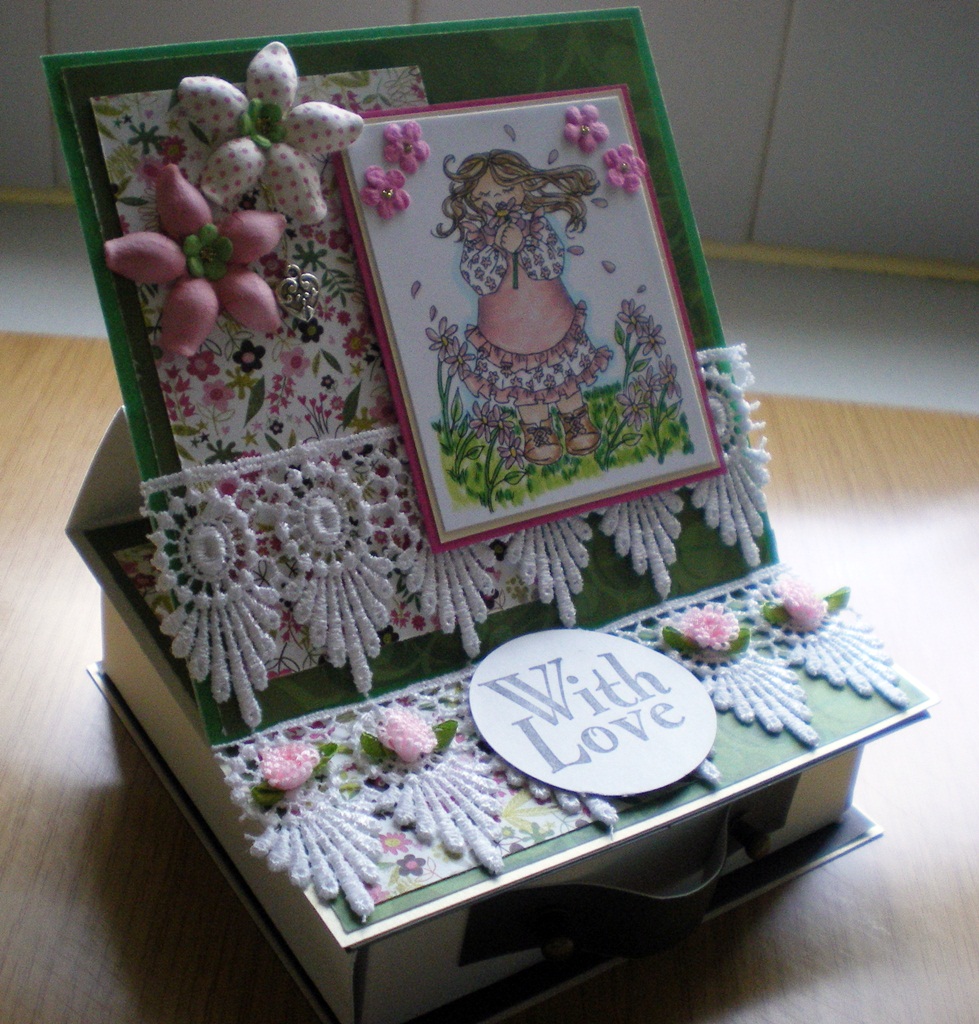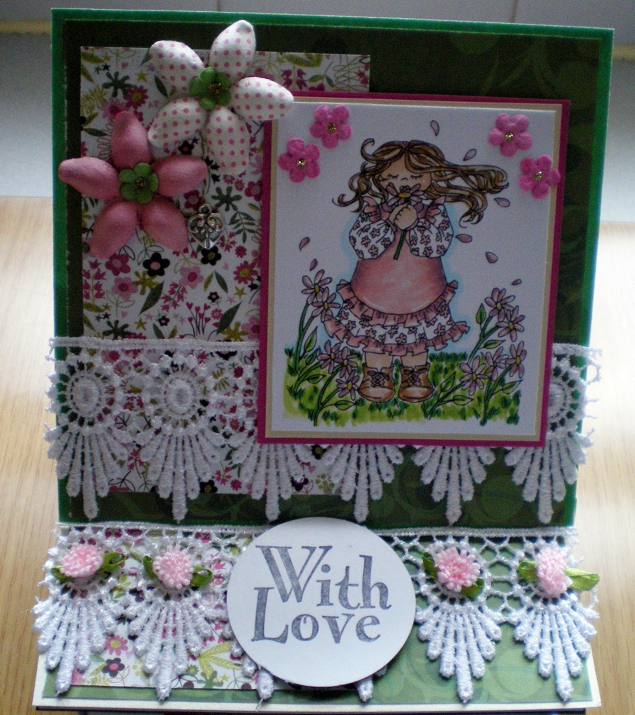 This shows the easel card opened and showing the stamped sentiment 'With Love' this came on an A5 set of rubber stamps featuring one of the Flower Fairies.