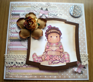 I have used one of my favourite sentiment stamps 'Happy Days' from Cuddly Buddly, I have used one of my brand new Tilda stamps that I won from Janiel, I could choose any two Tilda stamps I wanted and this was one of them, thank you Janiel I felt such joy winning these stamps. I have coloured Tilda with Copics, the papers are Bearlymine, I punched a border on one side using a MS punch I added lace, doily, flower and butterflies.