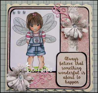I have finally decided to post this card that I made sometime ago but never blogged, the image is a digi by Elisabeth Bell, the papers are from my stash, I have used both die cuts and punches, pearls and a stamped gold embossed sentiment.