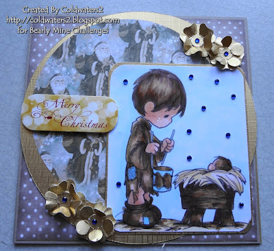 I have used papers from Bearly Mine Design sets, Simply Dots and Christmas Dreams. The image is from precious Moments I have coloured him with Copics, I used my X Cut circle cutter on both gold textured mirri card and the Christmas dreams paper, the flowers are punched using my new Tonic Petal Pair punches, i have added gems and of course a sentiment.