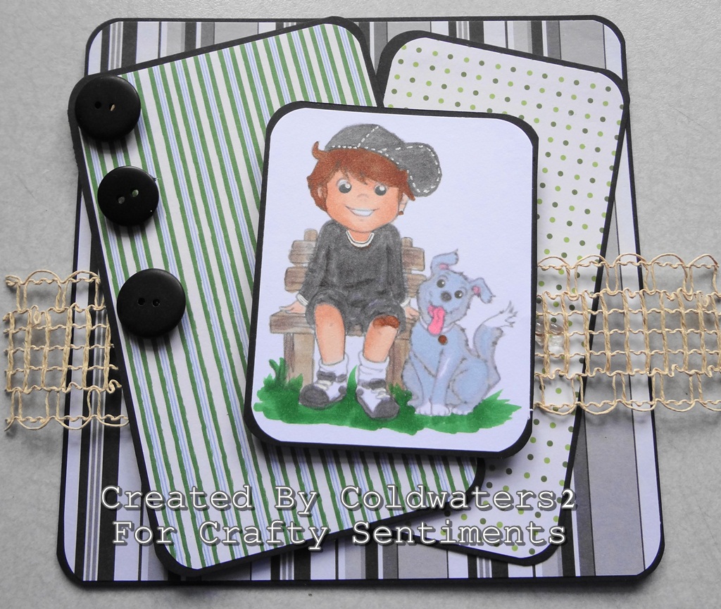 For my card I have used this fabby image called 'My Best Friend', I have coloured him with a mixture of Spectrum Noir and Copics. The papers are all Papermania but from different sets, all papers have been mounted onto black card stock, I added some raffia ribbon and buttons.