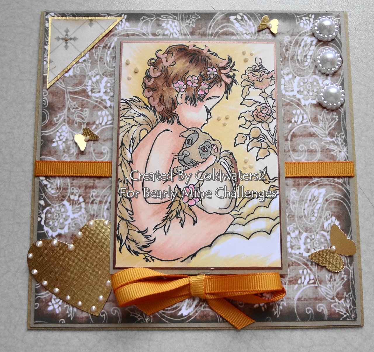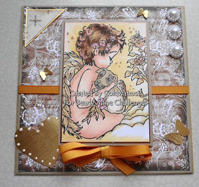 Here is my DT card using papers from Extreme Vol1, I have used a new stamp from Crafts and Me called 'Misunderstood' I have used Copics to colour. I have used gold linen card stock to mount both papers and image on also for the butterflies and heart, the pearls are flowers from Wild Orchid crafts, I added some SU ribbon and bow also Viva Decor on the heart and butterflies.