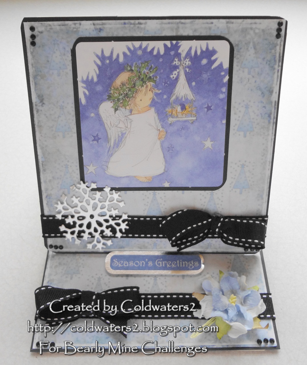 I have added black gross grain ribbon and bows, sentiments, gems, die cut snowflake and flower.
