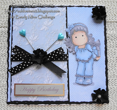 I have kept this quite simple and used black card for mounting the papers onto, I have used the same black card for the flowers which have been made using the Tonic perfect petal punches, I have added ribbon, bow, pins and gems, the sentiment is from Kanban, the image is Tilda coloured with promarkers, cut out and adhered with silicone glue.