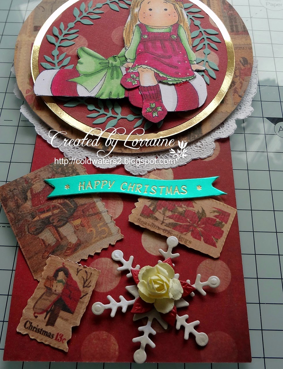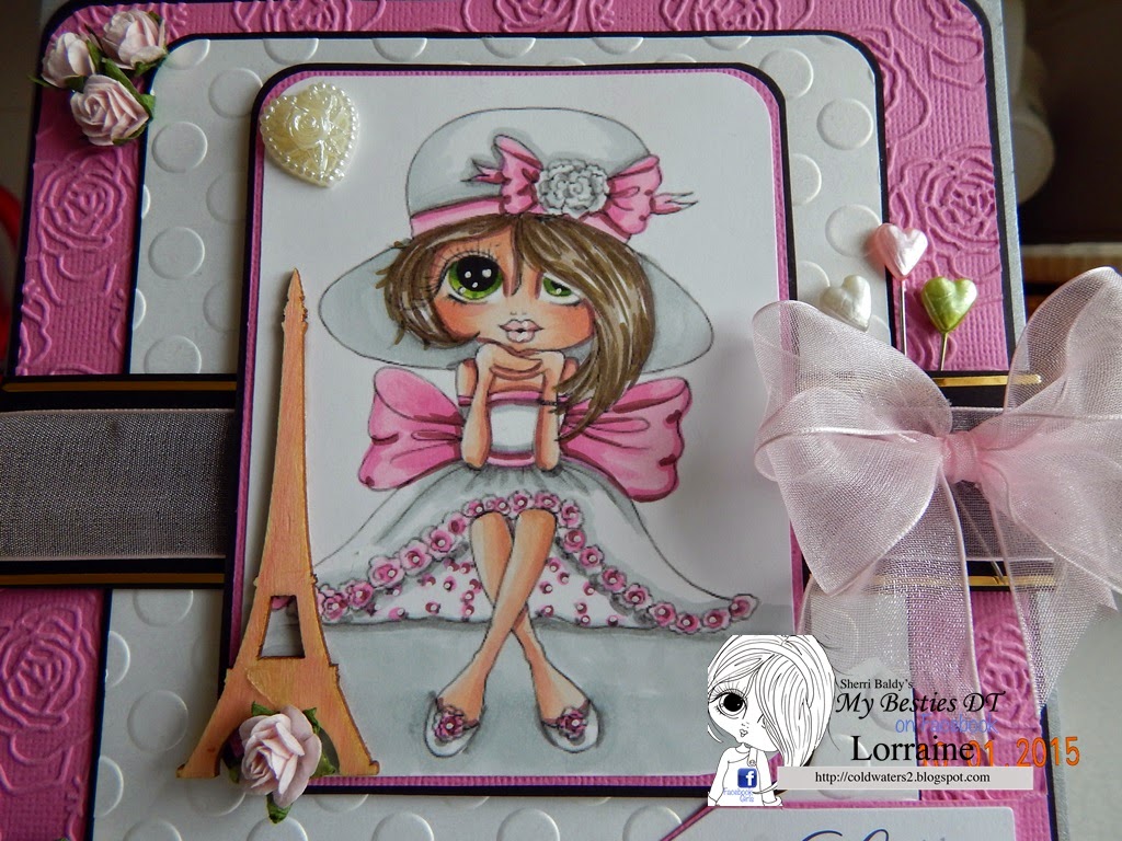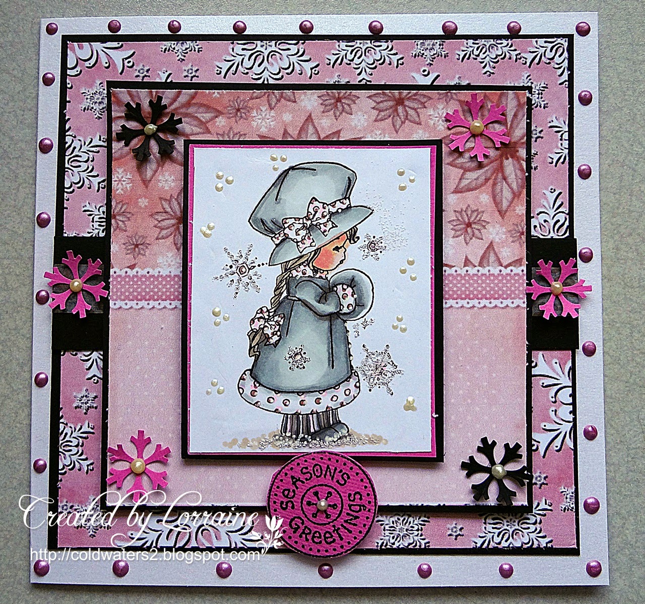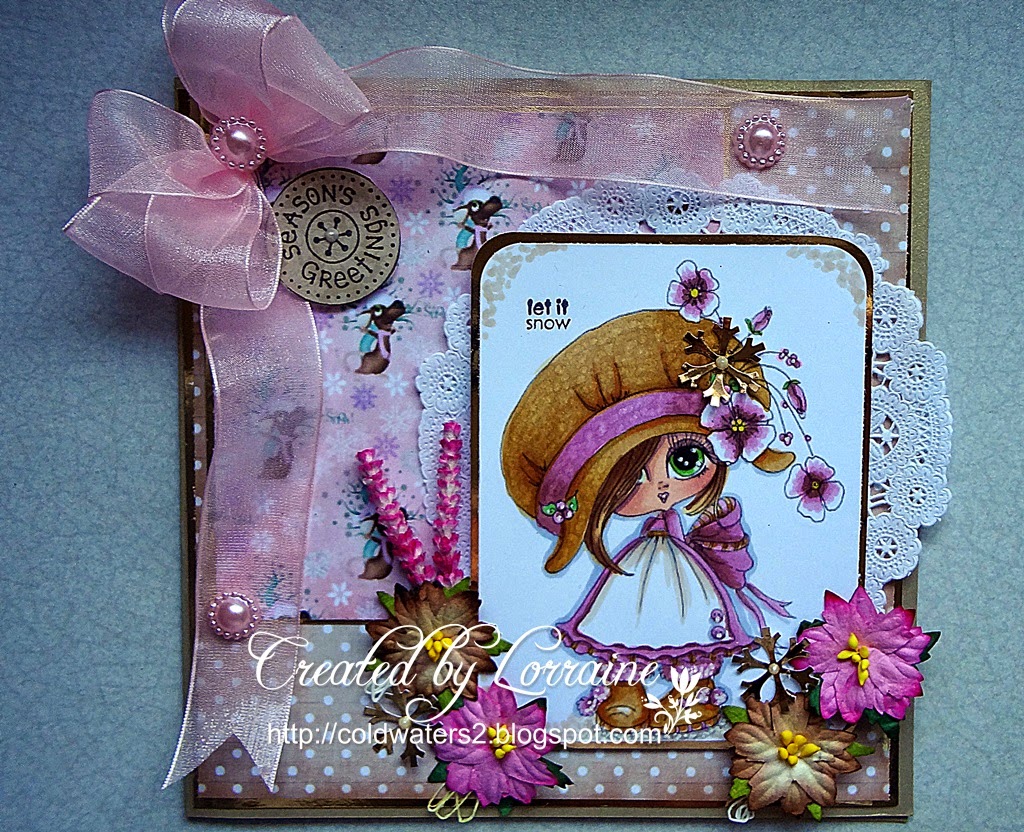 I have used an image from FITZTOWN called WINTER 8, I have coloured her with graph it markers and copics for the skin tones. The papers are LOTV and the sentiment is Kanban, I think. The image and papers have all been mounted onto black card stock.