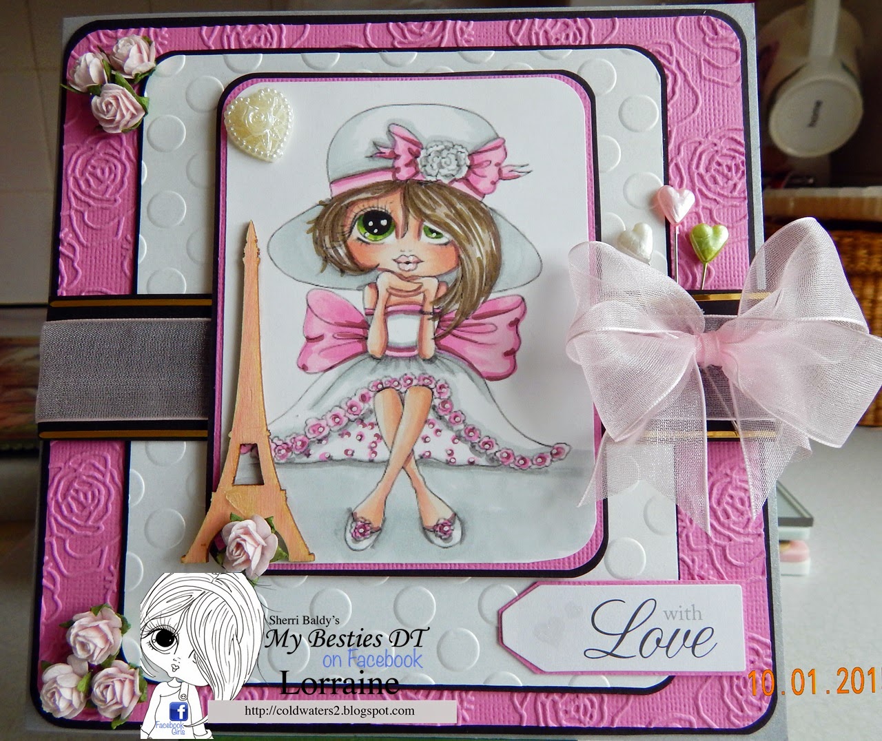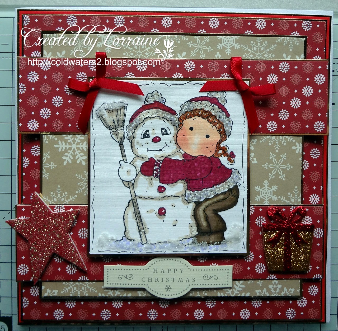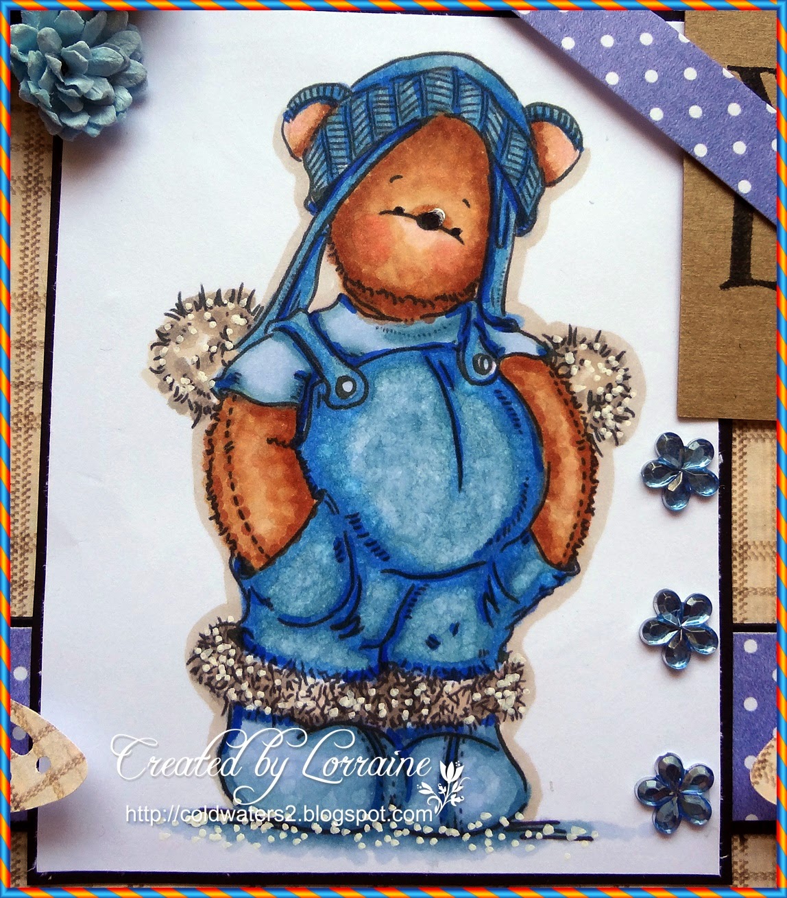 I have used an image from FITZTOWN called WINTER 8, I have coloured her with graph it markers and copics for the skin tones. The papers are LOTV and the sentiment is Kanban, I think. The image and papers have all been mounted onto black card stock.