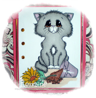 I have used the image of Love me Enough from Whimsy Stamps and is a digi image that I have coloured with promarkers. I have mounted it onto both pink card and silver mirror card the dp is Basic Grey Bittersweet, I have added a flower punched out using my Tonic punch added a button for the centre I also added some pink card candy I have kept it CAS as I am so loving this style.